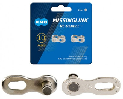 The KMC 10-speed connector with MissingLink offers a simple, reusable solution for connecting your chain. Its non-directional design makes assembly quick and easy, while the patented MissingLink connectors ensure a secure fit with increased safety. Compatible with both KMC and Shimano 10-speed chains, it provides a reliable and durable connection. Each card contains two links, offering convenience for maintenance or replacement. The KMC 10-speed connector ensures smooth performance and hassle-free assembly, perfect for keeping your bike in top condition. Features: - 10 Speed Connector - MissingLink Reusable - Non directional design for easy assembling - Patented MissingLink Connectors with increased safety - Compatibility: KMC & Shimano 10 speed chains - 2 Per Card