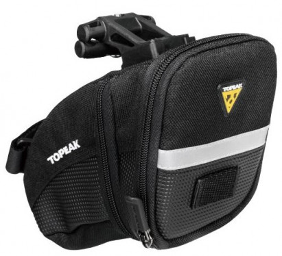 The Topeak Aero Wedge is an aerodynamic seat bag that holds tubes, tools and other repair items. Mounts and removes quickly with our innovative QuickClick® system. Four sizes offered to exactly fit rider’s needs. Key Features: - QuickClick® (F25) w/ seatpost strap -1000 denier nylon - 3M reflective strip, Safety light clip - Fits ø27.2 - ø34.9 mm - Medium, large sizes - 0.41 L / 25 ci (Micro) - 0.66 L / 40 ci (Small) - 0.98 - 1.31 L / 60 - 80 ci (Medium) - 1.48 - 1.97 L / 90 - 120 ci (Large) SIZE - 15 x 8 x 7.5 cm / 5.9” x 3.1” x 2.9” (Micro) - 17 x 12 x 8 cm / 6.7” x 4.7” x 3.1” (Small) - 20 x 12 x 10.5 cm / 7.9” x 4.7” x 4.1” (Medium) - 21 x 14 x 12.5 cm / 8.3” x 5.5” x 4.9” (Large) WEIGHT - 87 g / 3.06 oz (Micro) - 105 g / 3.70 oz (Small) - 135 g / 4.75 oz (Medium) - 176 g / 6.20 oz (Large)