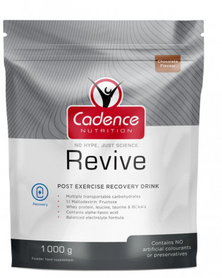The Cadence Revive Chocolate 1000g provides the ideal formulation to help prevent excessive muscle damage, fatigue and immune suppression. High intensity or resistance training can result in greater muscle tissue damage, requiring a higher concentration of protein to halt catabolism and accelerate muscle regeneration. Features: - Promote muscle recovery & hypertrophy - Oxidise fats during subsequent exercise - Reduce oxidative stress and tissue damage - Maximise recovery & improve immune function - Stimulate muscle anabolism & improve endurance performance