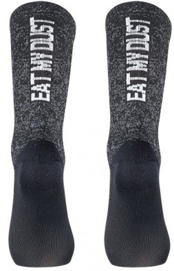 Step into comfort with ultra-soft Soft Air yarn, built with a stretchy multifilament structure that keeps feet cool and dry. Tiny air pockets between the fibres allow moisture to escape, ensuring a fresh feel even on intense rides. A dual-structure design adds both durability and ventilation. The compact weave at the front resists wear, while the open mesh at the back boosts airflow. Finished with a bold “Eat My Dust” graphic, these socks bring both style and performance to every pedal stroke.