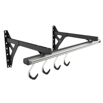 Maximise storage without compromise. Sliding and rotating hooks let bikes sit closer together, freeing up valuable space. A smooth gliding mechanism and swivel hook ensure effortless access to any bike. Suitable for all models, including e-bikes and those with mudguards. Auto Lock Tech keeps unweighted hooks steady, preventing unwanted movement. A sleek, modular system built to last and expand as your collection grows. Features: - Kit contains everything required for mounting -- SpaceRail on suitable walls - Adjustable rail positioning from 410mm / 16.1" to 650mm / 25.6" out from the wall - Useful storage space above the brackets for bulky items (weight permitting) - Easy Load System with Auto Lock Tech - 360° rotating stainless steel hook with protective polymer cover - Universal hook holds all bikes up to 30kg / 65lbs (3” tyre max) including e-bikes, with or without mudguards - Fat Tyre Adapter, available separately for 4”- 5” tyres - Easy install with just four screws per bracket. - SpaceRail Kits contain everything you need - Each rail can hold up to 100kg / 220lbs and is 114cm / 44.9" long - Hooks are rated to hold 30kg / 65lbs